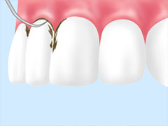 歯周ポケットの内部にまで歯石が付着した状態です。スケーリングに加え、キュレットと呼ばれる器具で歯周ポケット内のプラークや歯石を除去する処置を行います。 最後に歯の表面をツルツルに磨き、汚れの再付着を防ぎます。 |